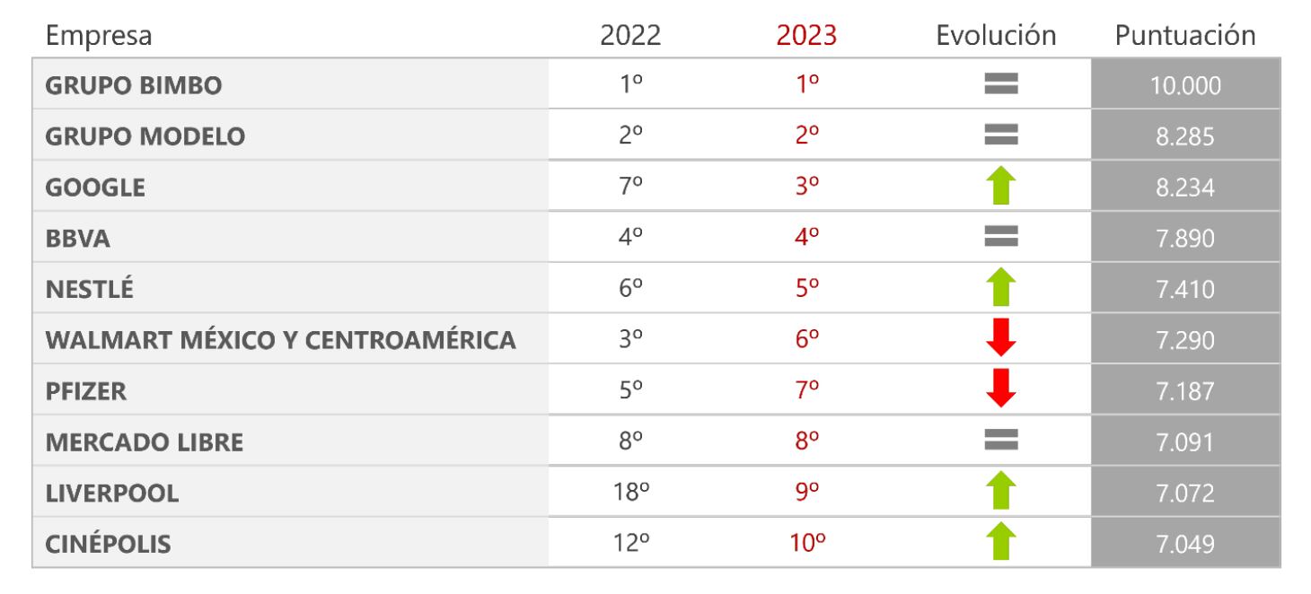 En 2023, Grupo Bimbo continúa en el primer puesto del ranking Merco Empresas, tras seis años en el mismo lugar. Siguen en la clasificación Grupo Modelo, Google, BBVA, Nestlé, Walmart México y Centroamérica, Pfizer, Mercado Libre, Liverpool y Cinépolis.