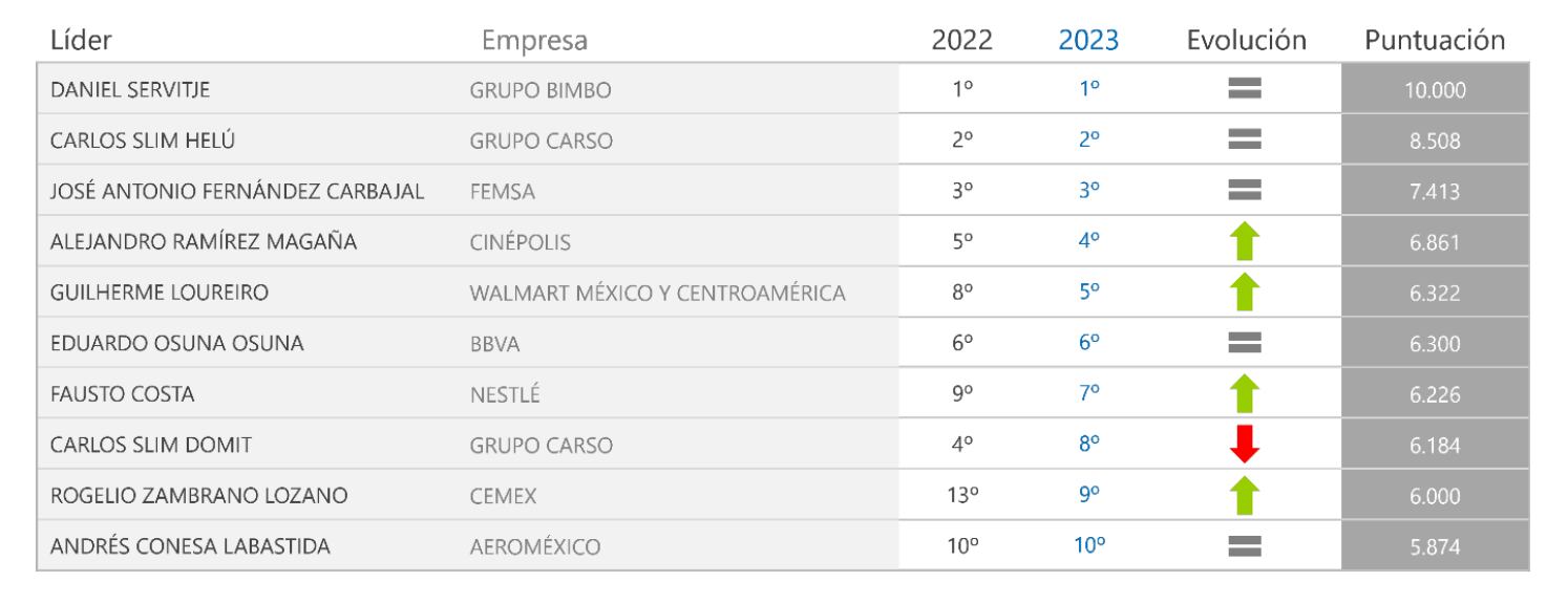En el ranking de los directivos empresariales con mayor reputación en México en 2023 encontramos en primera posición, por octavo año consecutivo, a Daniel Servitje (Grupo Bimbo), seguido de Carlos Slim Helú (Grupo Carso), José Antonio Fernández Carbajal (FEMSA), Alejandro Ramírez Magaña (Cinépolis), Guilherme Loureiro (Walmart México y Centroamérica), Eduardo Osuna Osuna (BBVA), Fausto Costa (Nestlé), Carlos Slim Domit (Grupo Carso), Rogelio Zambrano Lozano (CEMEX) y Andrés Conesa Labastida (Aeroméxico).