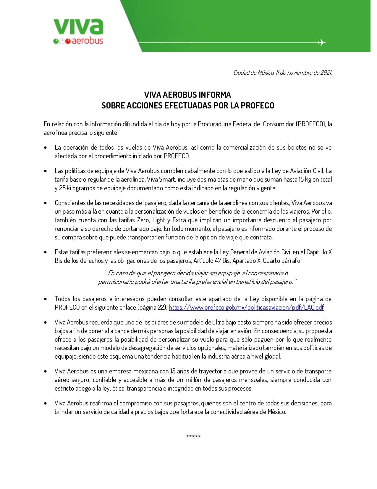 La aerolínea Viva Aerobus respondió a la Procuraduría Federal del Consumidor (Profeco) que sus tarifas para equipaje de mano cumplen con la ley.