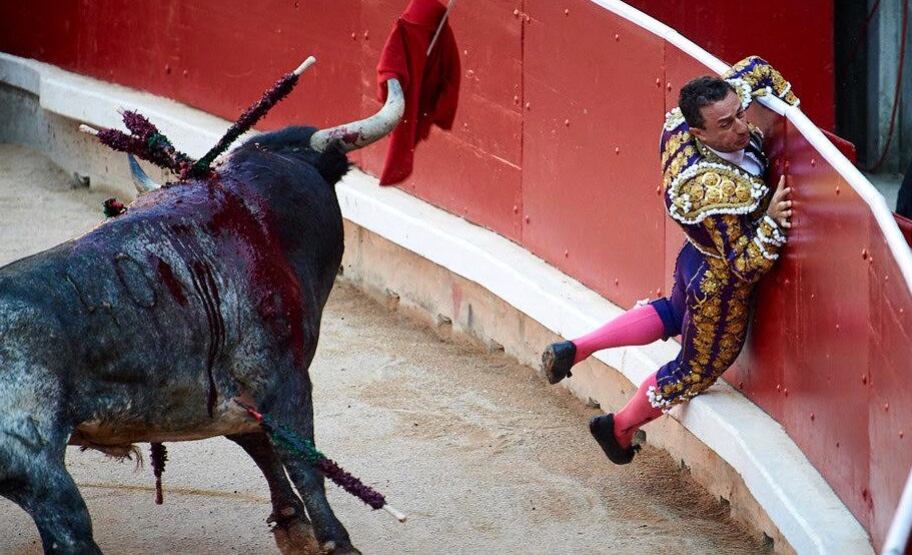 Y chillan las tribunas ante la cogida que el toro le pega al primer torero de la tarde, que corre cojeando a esconderse en el burladero con su tutú rasgado, chin… y era el único que le quedaba visible.