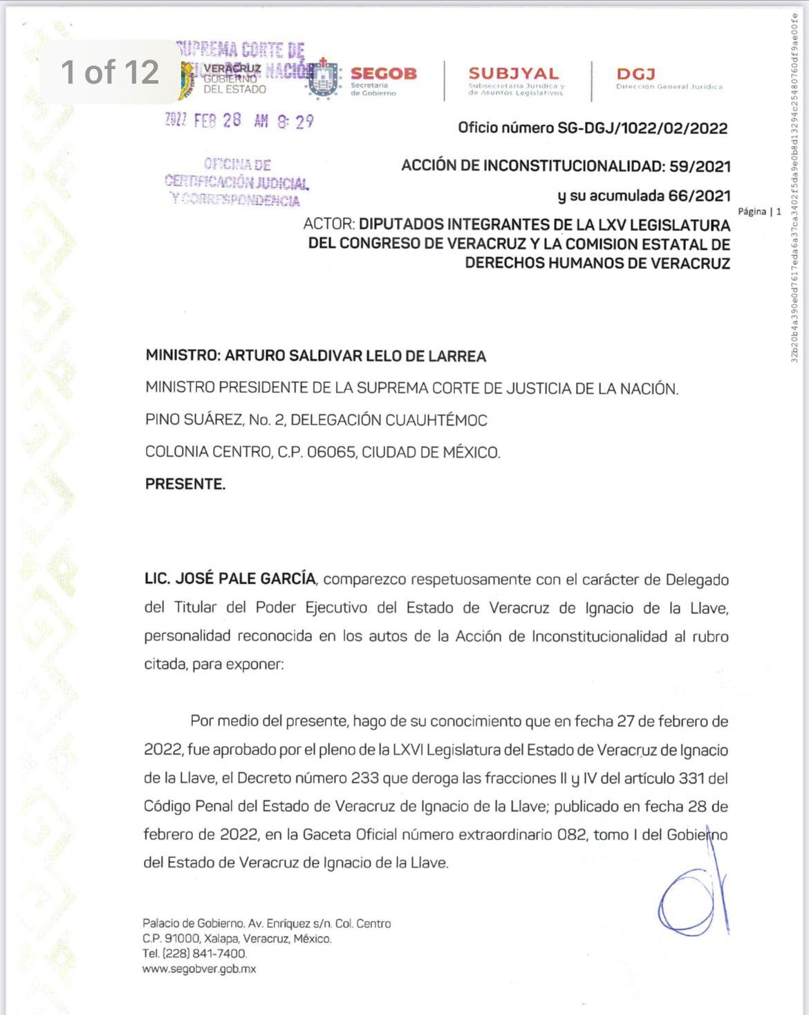 Segundo, con una velocidad inusitada, ya en la madrugada del lunes 28 de febrero, el día que sesionaba la Corte, se publicó en la gaceta oficial del estado de Veracruz el articulo reformado. Y para las 8:25 am del mismo lunes, ya había dos escritos presentados ante la Suprema Corte en los que la Secretaría de Gobierno veracruzana pedía a ésta dejar de llevar a cabo el juicio, toda vez que “la norma impugnada ha sido reformada o sustituida por otra”.