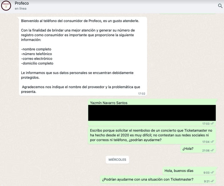 Y ni hablar de Profeco, que dicen atenderte a través de WhatsApp, pero en cuanto se les informa que el tema es con Ticketmaster, dejan de responder... ¿por qué?