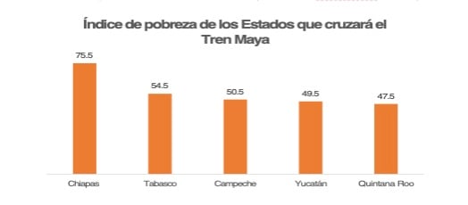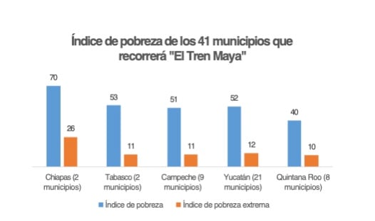 - La ruta del tren cruzará por 42 municipios cuyo promedio de pobreza y pobreza extrema es de 51 y 12 por ciento, respectivamente. Conforme al medio “Sin embargo”, los promedios de pobreza de esos municipios agrupados por entidad federativa son los siguientes (Coneval 2015):