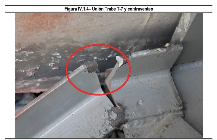 Los pernos mal soldados, contaminantes en la soldadura, menos pernos de los requeridos, falta de protección tras soldadura (se pusieron parches de concreto diferente), la cimentación era poco profunda.
