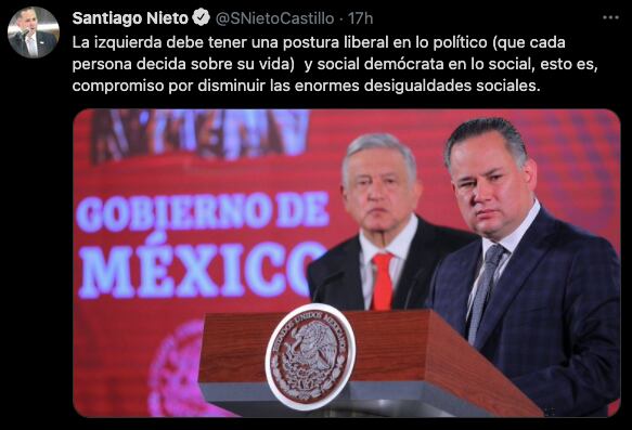 -En la cuenta de Santiago Nieto, puede verlo usted mismo, aparecen posturas políticas apegadas a López Obrador, e incluso, ya recientemente (ayer domingo) apareció una foto junto con el presidente.