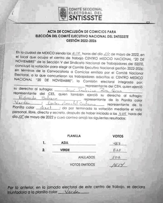 En el Centro Médico Nacional “20 de Noviembre”, la planilla verde de Ramírez Chávez superó por casi 2 a 1 en votos a la azul: 825 por 487 y 202 nulos, para un total de 1514.