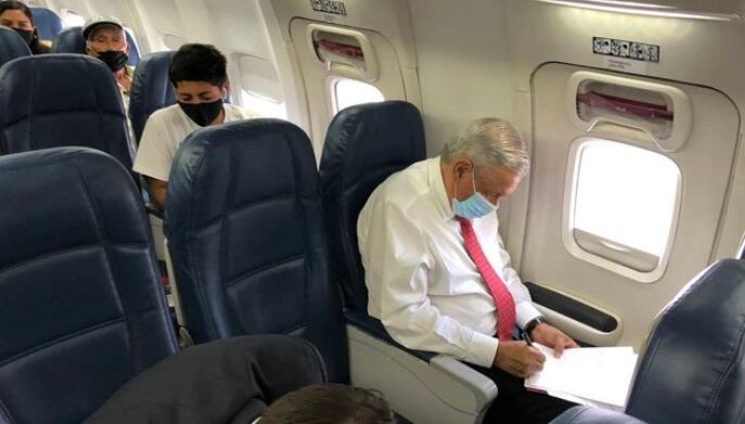 “¡Ahí viene, es él, es él, es el presidente!”, se levantó un rumor entre los pasajeros del vuelo de Aeroméxico, Villahermosa a Ciudad de México, del domingo 13 de marzo pasado. De espaldas al frente del avión, pues al querer colocar mi mochila la sobrecargo me pidió esperar, vi pasar rápidamente a un grupo de 3 o 4 personas. Reconocí una chamarra negra que culminaba en una cabellera totalmente blanca; hacía fresco inusual, por la lluvia. Sí, era el presidente. Tomó asiento 4 o 5 filas detrás de la mía.