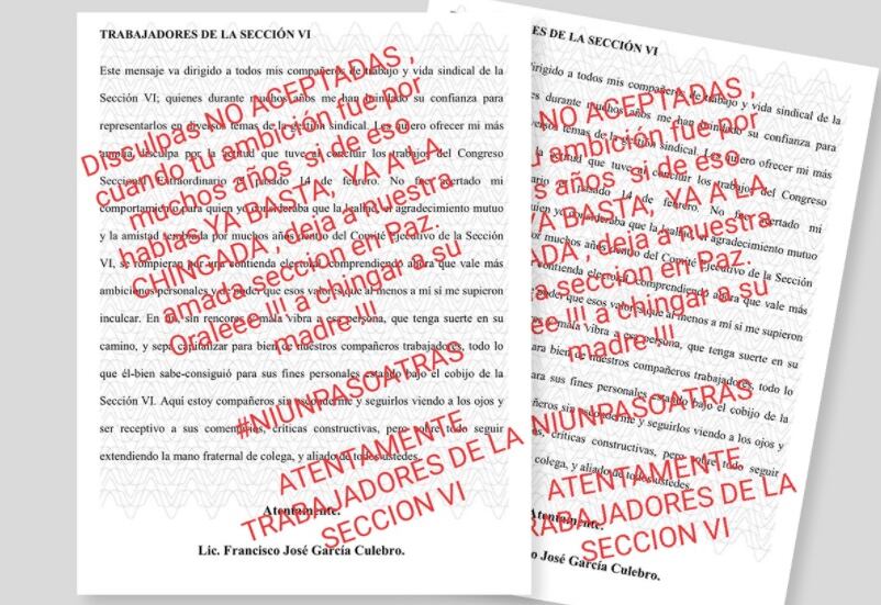 Después de esa primera agresión, el decadente patriarca en una carta se disculpó con los trabajadores de la sección de las estancias infantiles, por “la actitud que tuve al concluir los trabajos del Congreso Seccional Extraordinario el pasado 14 de febrero. No fue acertado mi comportamiento para quien yo considere que la lealtad, el agradecimiento mutuo y la amistad sembrada por muchos años dentro del Comité Ejecutivo de la Sección VI se rompería por una contienda electoral”. La respuesta que alguno de ellos le dio fue con recuerdos familiares.