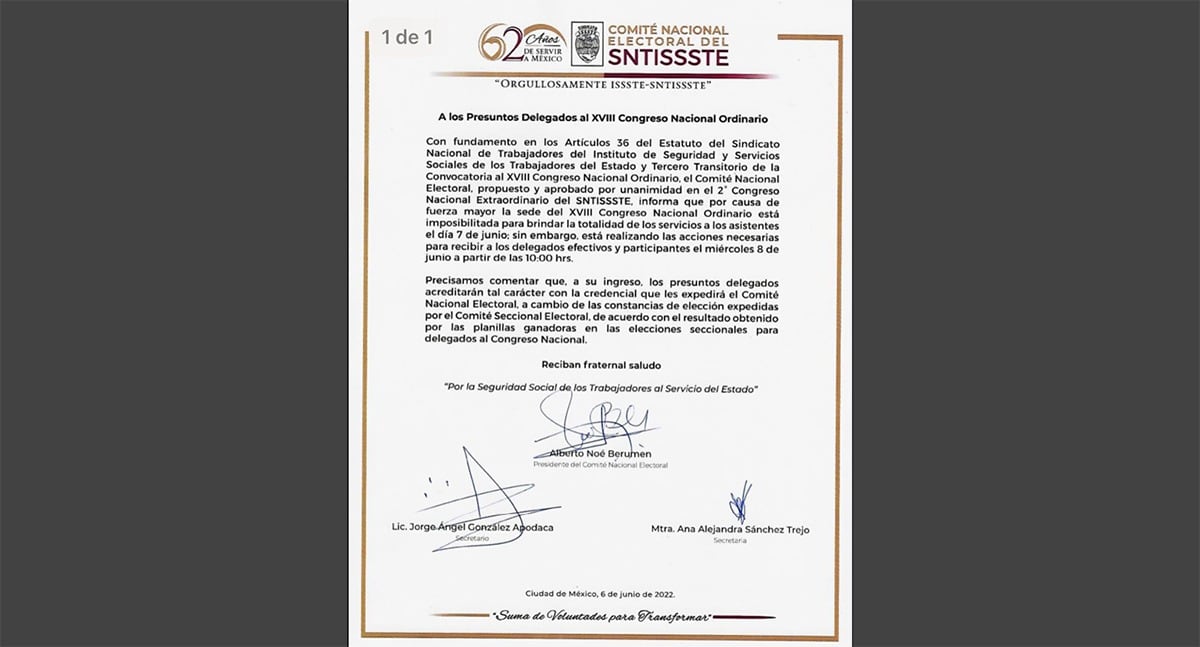 Un comunicado del comité nacional electoral firmado por Alberto Noé Berumen -la inclusión de su hijo Daniel Noé López en la planilla de Norma Liliana erosionó su supuesta imparcialidad-, Ana Alejandra Sánchez Trejo y Jorge Ángel González Apodaca confirmó lo que hasta entonces era un rumor: el congreso se recorrería un día para realizarse 8, 9 y 10 de junio, en lugar de 7, 8 y 9 como ordena la convocatoria.