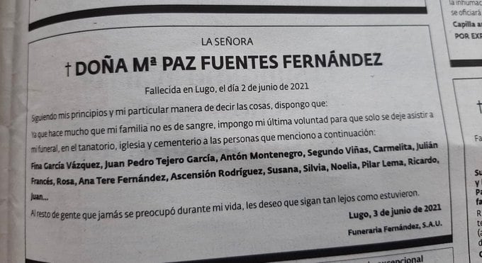 En España una mujer se hizo viral al publicar en el periódico los lineamientos a seguir para su funeral incluyendo las invitaciones.