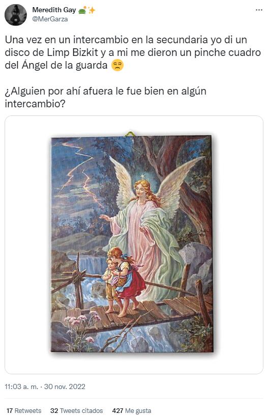 “Una vez en un intercambio en la secundaria yo di un disco de Limp Bizkit y a mi me dieron un pinche cuadro del Ángel de la guarda. ¿Alguien por ahí afuera le fue bien en algún intercambio?”