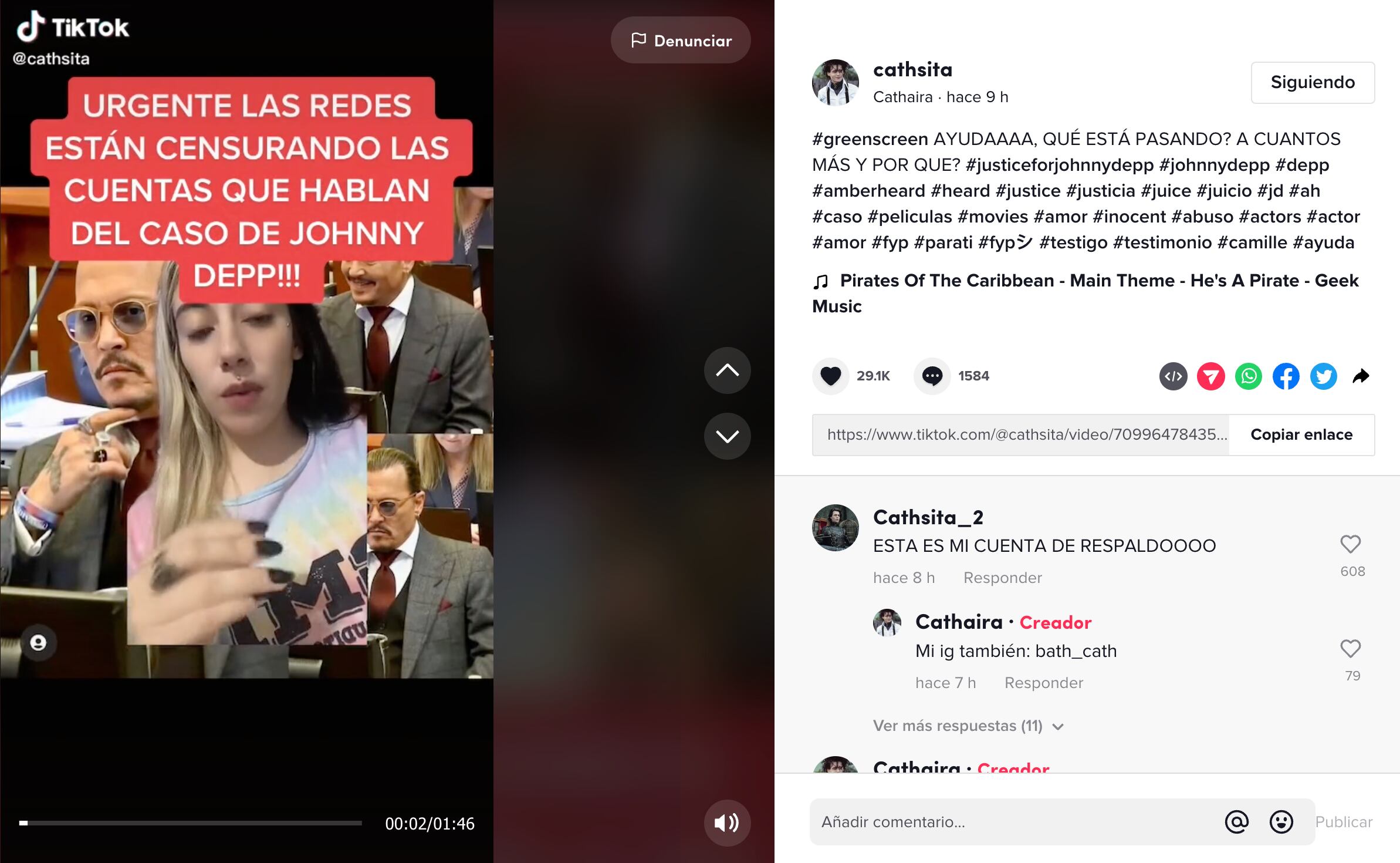 Por otra parte, Cathaira denunció abiertamente que las medidas tomadas por TikTok contra quienes hablan del juicio de Johnny Depp vs Amber Heard son censura.